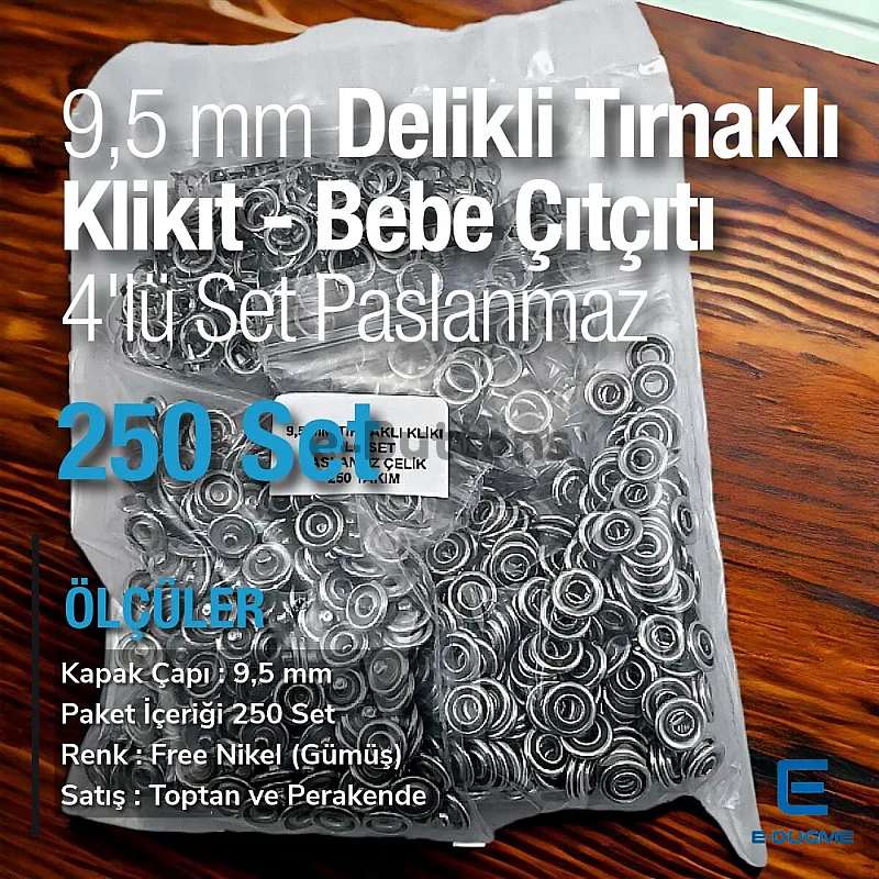Made of stainless metal, click prong snap fastener 9.5 mm - 3/8" . The stainless metal baby clothes prong snap fastener is 9.5 mm resistant to rust. Metal coating colors give products a more elegant appearance. 9.5 mm prong snap fasteners are used in kid's clothing, baby slacks, blouses and shirts and in many sectors. It acts as a material that allows the two sides of the product to be closed and opened by overlapping.